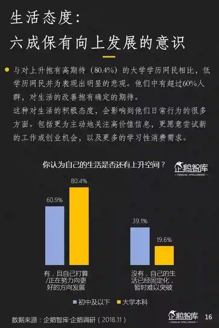 还有我们非常看重的,向上的生活态度。它会在很多方面影响到低学历网民参与到社交、资讯等信息流转选择,以及泛娱乐内容的口味和沉浸度。