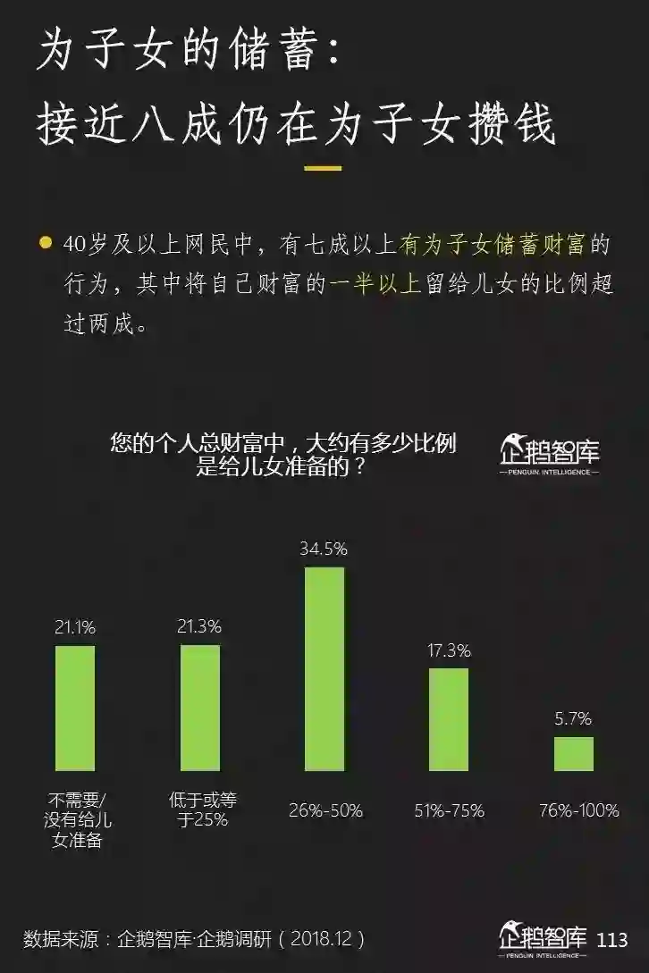 在中老年网民中,有接近八成在为子女攒钱,其中规划将自己财富的一半以上交给子女的网民,占比约为23%。