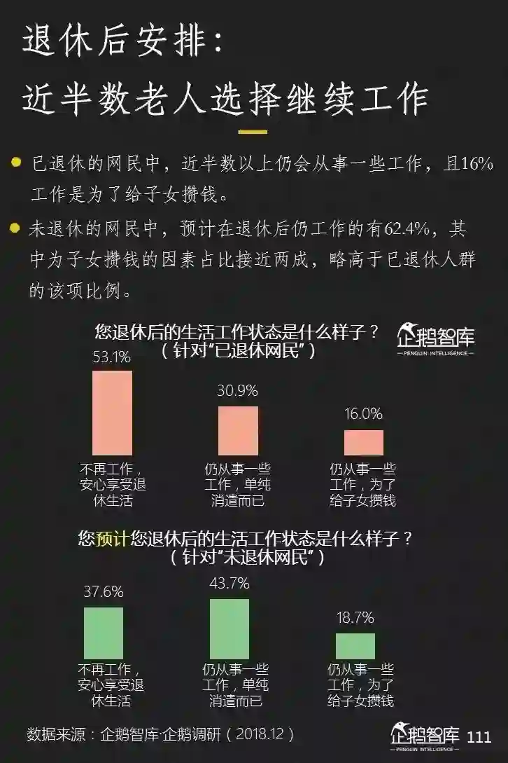 在目前已经退休的网民中,有接近半数的人选择了继续进行一些工作,而尚未退休的中老年人,对将来退休后是否继续工作,则抱有更高比例的意愿。