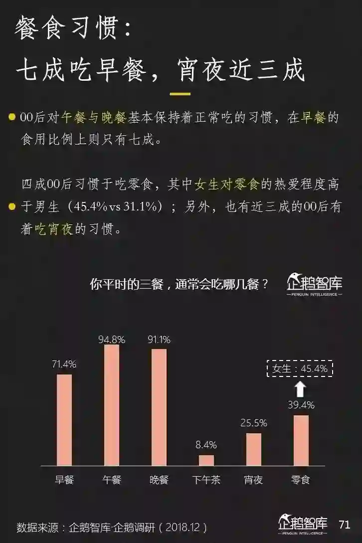 晚睡带来的影响除了更多“整段时间”可以消费一些沉浸式的娱乐内容外,对饮食的影响同样巨大。年轻人开始更多的形成吃宵夜的习惯,而早餐的渗透率则明显低于午餐与晚餐。