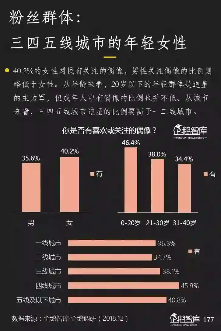 我们看到的现象和数据中,20岁以下年轻群体在追星的热情和消费上,都领先于其他群体,特别是年轻女性。但同样值得我们注意到是,在21-30岁,甚至31-40岁成年人中,关注偶像和为此消费的比例同样可观。