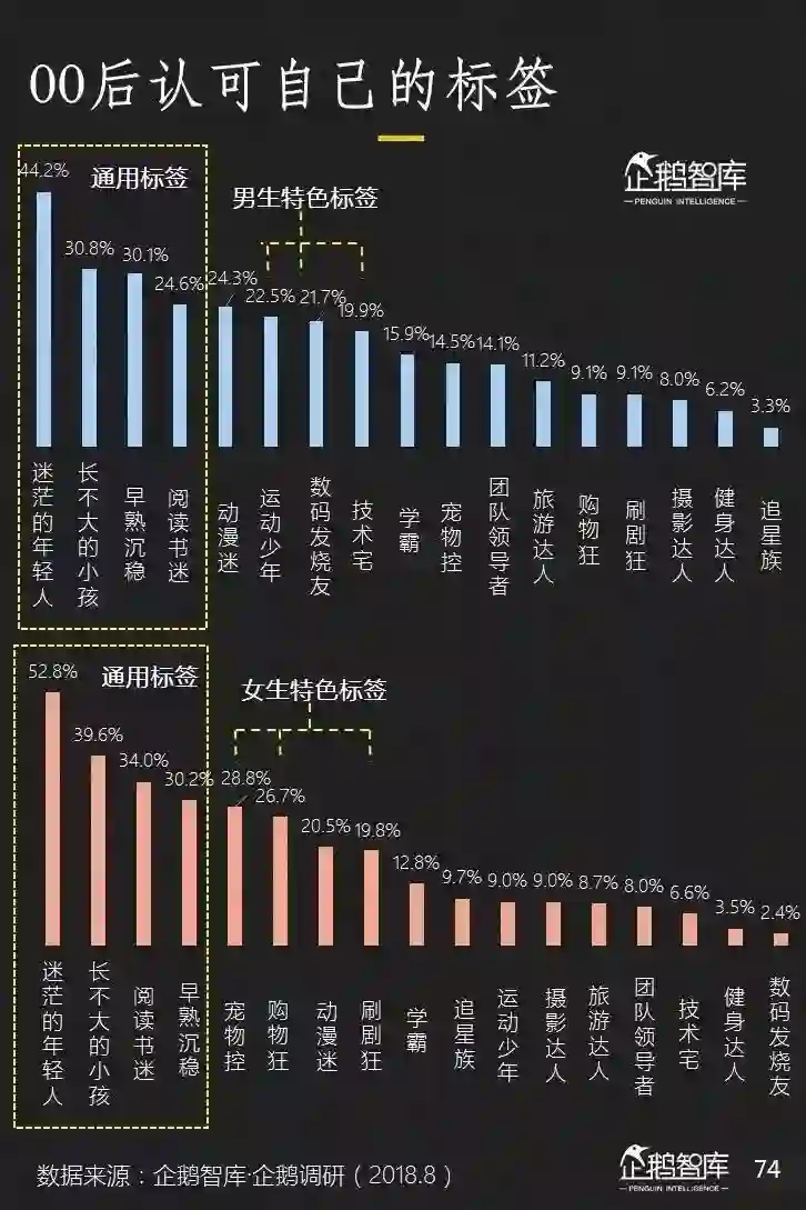 男孩们对运动和数码产品更为痴迷,女孩们则更喜欢把自己的身份与宠物控,购物狂联系在一起。至于动漫,则是男女们都喜欢的一类。