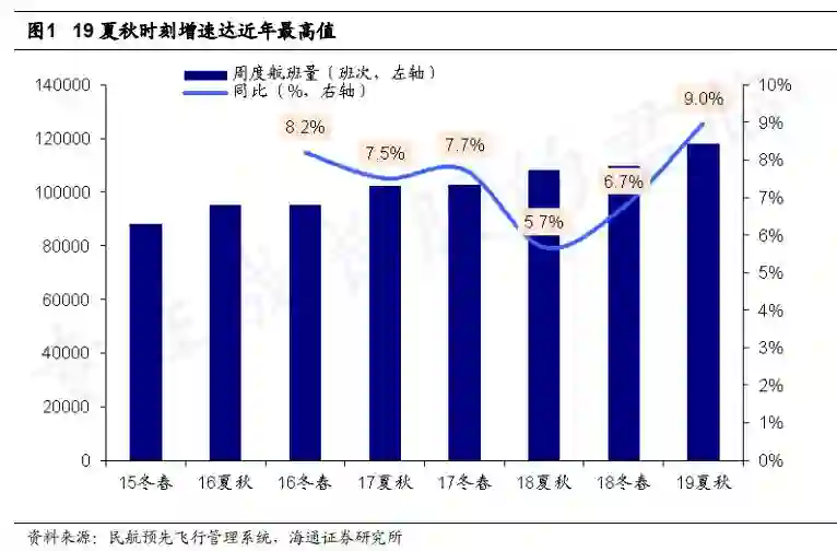 2019年,民航公布了夏秋航季时刻表,航班量同比增长9%,增速同比增长3.3个点。