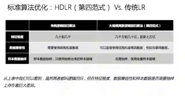 另外一条路其实是像谷歌、百度走的方向,是微观特征和简单模型。例如我们依然使用逻辑回归的算法,但是我们把一个变量的数量提升到亿级别甚至几十亿级别,这样通过变量的组合,同样可以用线性模型表达非线性的问题,从而得到比较好的效果。