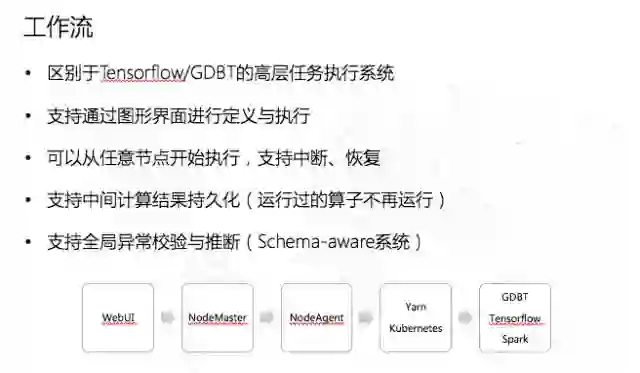 先知本质上来讲,在Web上做的UI提交的任务,可以通过一个Kubernetes的架构,它会翻译成一个Spark的任务或者GDBT的任务。也就是说,我们在界面上拖拖拽拽的结果中间会转换成图,然后进行一定的优化和执行。所以说先知里面其实是有一个比较高层次的任务执行工作流引擎。