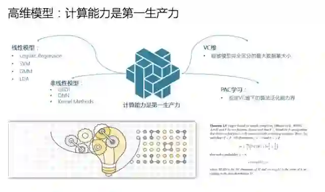 其次是模型规模。我们原先用统计的方式做模型,通常有十到二十个变量,现在用大数据、分布式的方式可以做到成百上千个变量。由于现在拥有海量的数据,所以足够支撑一个上亿乃至数千亿规模的维度变量,这就需要极高维度、分布式的机器学习系统。
