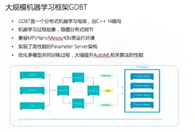 基于此,第四范式自主研发了大规模分布式并行计算框架GDBT(General Distributed BrilliantTechnology)。我们自主研发机器学习框架的目的,是因为像Tensorflow这类的机器学习框架面向的是“深”,就是我们前面所讲的左上角的象限,它可以接受比较小的数据输入,但要做比较复杂的结构,就需要非常多经验丰富的机器学习专家,针对一个问题要花费三个月甚至是更长时间才能调出一个好的模型。