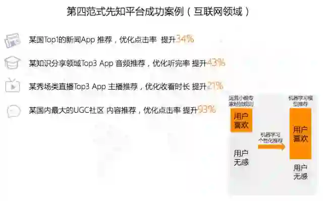 此前,我们运用先知平台在金融领域和互联网领域完成了一些成功案例。在实际的运用过程当中,不需要专业的人员不停调整模型的结构,我们采用一种比较统一的高维度的若干组机器学习,或者基于树的逻辑回归算法,同时辅以大量的数据和机器学习的过程来完成这些案例。