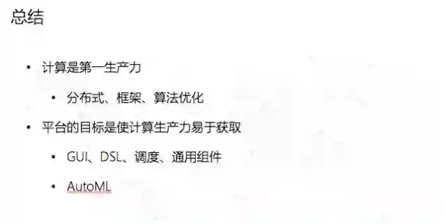 总结上来讲,先知作为一个平台的目标是使计算的生产力易于获取,我们尽量让大家用GUI和简单的脚本形式,表面上看起来和传统用SaaS做一个模型是一样的,背后实际上是一个高维度的机器学习的框架。对于机器学习来讲,计算是第一生产力——调参的过程就意味着将一个机器学习的过程做几十次或者上百次,而先知的GDBT框架比Spark可以快上数百倍,这就意味着在同等时间内、同样的计算资源下,先知能有探索更高维度模型的机会,最终减少对使用者的需求。