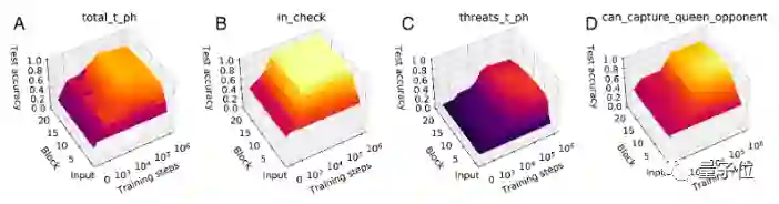 为研究AlphaZero如何「学习」的,研究者构建了一个人类理解国际象棋的函数c(z0)。其中,z0为一个象棋特定排布概念,c(z0)以专业国际象棋引擎Stockfish 8评估分数作为参考。