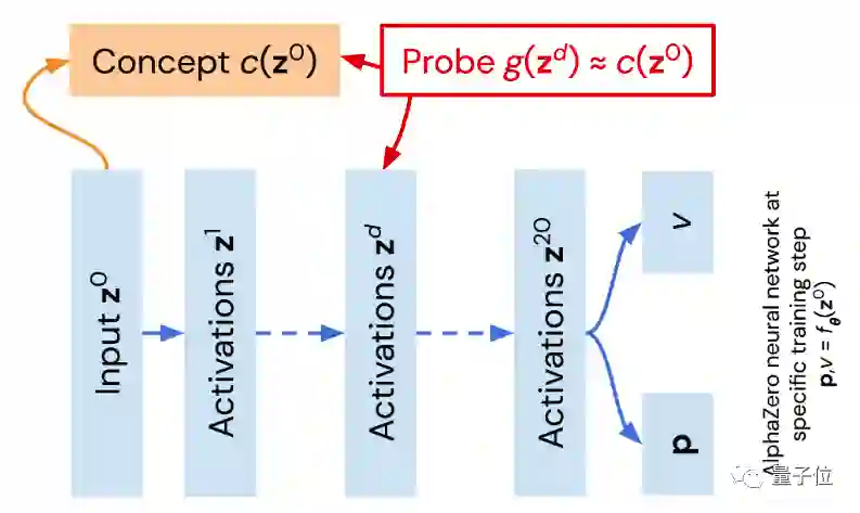 再从AlphaZero角度,设一个广义线性函数g(zd),作为在不同层取值的探针。训练设定下,g(zd)将不断趋近𝑐(𝐳0),研究者通过观察g(zd)与𝑐(𝐳0)近似情况,以确认系统是否理解相关概念。