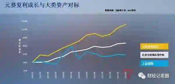 下面这张图非常的有意思,这是我们将元葵复利成长曲线与几个大类资产的比对。