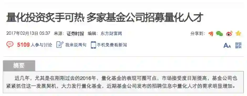 《证券时报》曾报道,随着量化投资在中国发展的基本条件渐渐完备,多家基金公司对量化人才的需求明显增加。