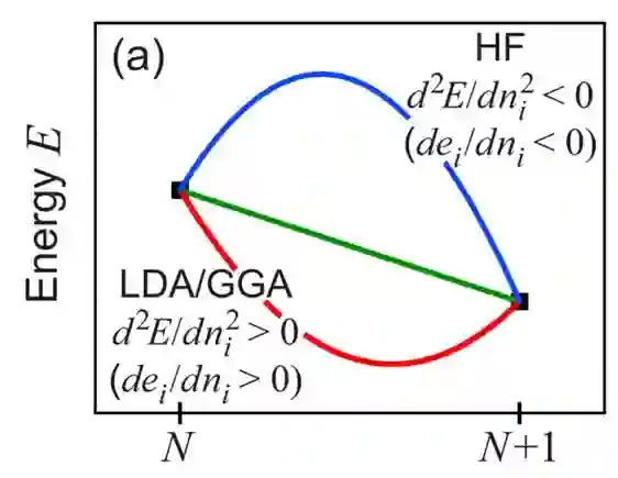 追本溯源,究竟为什么 DFT 无法给出令人满意的带隙值?理论上,以 Hohenberg – Kohn定理为基石的DFT 完全可以给出体系的基态能量以及电荷密度分布。但是,这需要一个前提,就是必须知道体系精确的交换关联泛函以及它的导数。实际计算中,总是要对交换关联泛函引入近似,如 LDA 或 GGA。根据 Koopmans 理论,体系能量对电子占据数的二阶导数应为零 (图3中的绿线)。在 LDA 或 GGA 近似下,该二阶导数大于零 (图3中的红线)。在Hartree – Fock (HF) 理论中,该二阶导数小于零 (图3中的蓝线) [4]。这是LDA 或 GGA 低估带隙、而 HF 高估带隙的根源。这也是杂化泛函方法,即在 LDA 或 GGA 泛函中加入部分HF 交换项,可给出较合理带隙值的根源。