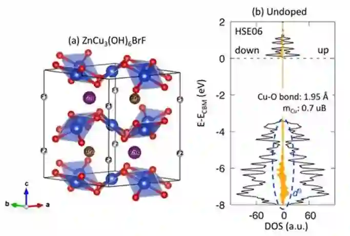 图4. (a) ZnCu3(OH)6BrF 结构示意图。(b) 未掺杂的ZnCu3(OH)6BrF 态密度图。