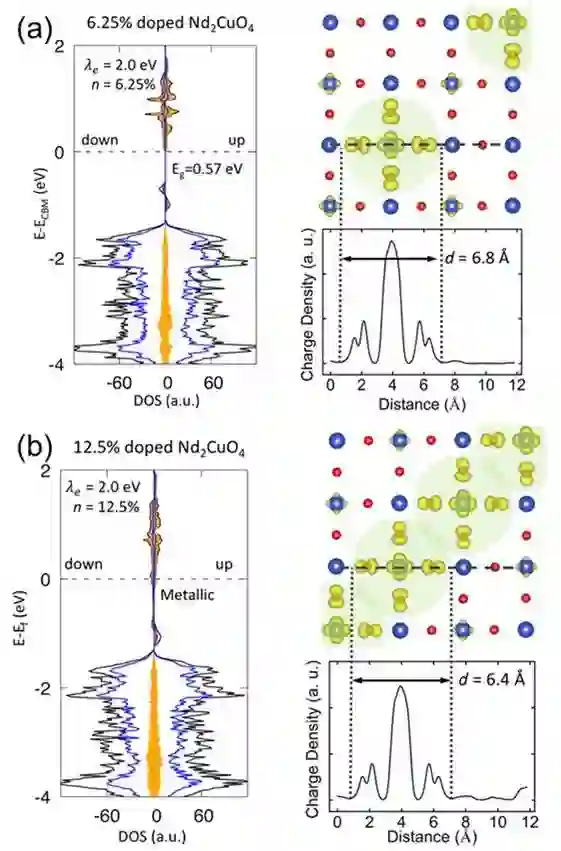 图6. (a) 0.0625 e/Cu 和 (b) 0.125 e/Cu 掺杂浓度下Nd2CuO4 的态密度、掺杂电子电荷密度以及极化子示意图。