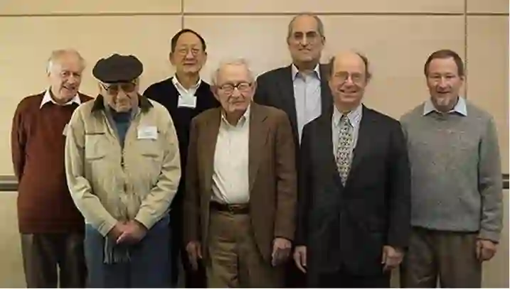 图1. 菲利普·安德森九十岁寿诞时在普林斯顿与部分来宾合影:(从左至右) Anthony Leggett, Walter Kohn, Daniel Tsui (崔琦), Philip Anderson, Edward Witten, FrankWilczek, Douglas Osheroff.