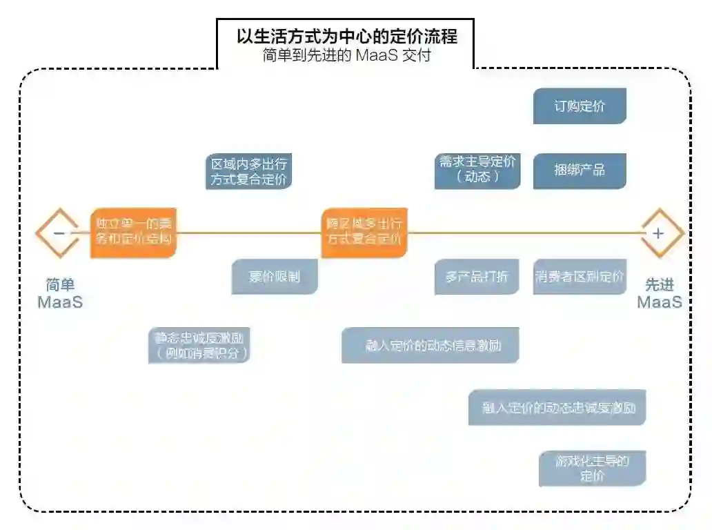 如图1,MaaS 有八个关键属性。其一半的属性与用户体验有关,而另一半是关于技术和流程的应用。这些都要都基于互联网广泛而可靠的使用。如图2,我们以MaaS 的定价为例,展示MaaS 功能的维度,它可以从一个单一服务的定价出发,到提供基于消费者个性化生活方式需求解决方案的定价。