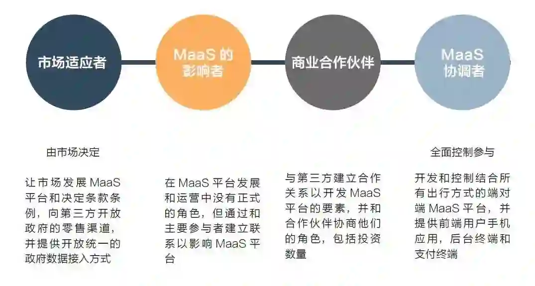 在整合了广泛利益相关者和商业模式的公共和私营领域中,政府的交通出行管理部门可以专注于中长期规划(3 年及以上)、技术路线,以及相应的激励政策推动MaaS 的持续发展。