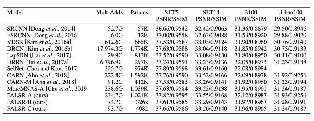 在 FLOPS 相当的模型对比中,本研究提出的 FALSR-A 模型优于 CARN [Ahn et al., 2018](图 3)。此外,FALSR-A 模型还在四个数据集和三个目标上超过 DRCN [Kim et al., 2016b] 和 MoreMNAS-A [Chu et al., 2019]。它的 PSNR 和 SSIM 值高于 VDSR [Kim et al., 2016a]、DRRN [Tai et al., 2017a] 等,且 FLOPS 低于后者。