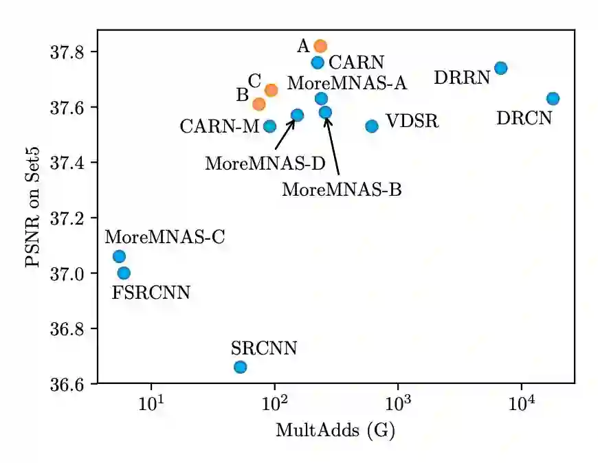 目前已有的超分辨率模型大多数都是人工设计的,它们很难进行压缩或者微调。与此同时,神经架构搜索已经在分类任务中取得了极好的效果。根据这一趋势,Chu et al., 2019 提出了使用强化遗传搜索方法处理 SISR 任务,该方法优于 VDSR [Kim et al., 2016a] 等流行网络。