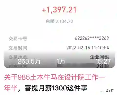 诸如985土木牛马在设计院工作一年半,喜提月薪1300的案例比比皆是。