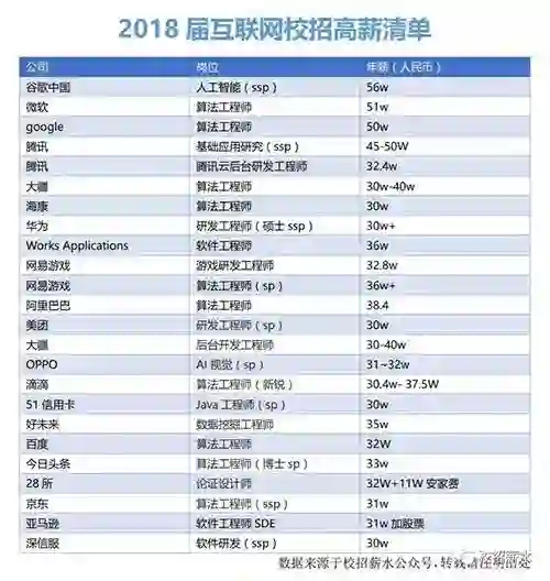 其中,谷歌中国、腾讯、大疆、海康、华为、网易游戏、阿里巴巴、滴滴、百度等知名互联网企业,今年给校招生开出了30万以上的年薪: