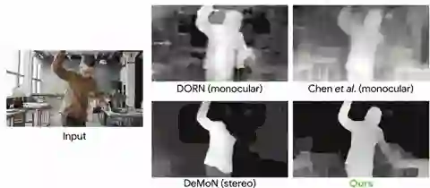 这篇论文要解决的任务「从单个摄像头估计运动物体的深度」乍看上去是无法完成的。这篇论文用了很巧妙的方法,一方面,作者们把 YouTube 上用户们自己上传的「时间静止」视频作为数据集,它们提供了海量的、天然的、带有人物的三维空间回放,经过传统方法还原之后就可以作为标注数据,免去了采集之苦。这实际上提醒我们,除了用传统众包方法专门收集数据集之外,网络上还有许多公开数据经过处理以后也可以成为很有价值的训练数据集。
