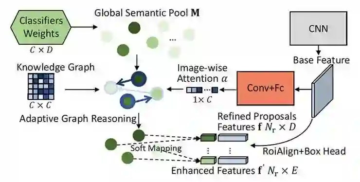 随着目标识别的规模越来越大、粒度越来越细,类别不平衡、遮挡、分类模糊性、物体尺度差异性等等问题越来越明显。我们很容易想到,人类视觉识别能力中的一个重要环节是「基于常识的推理」,比如辨认出了 A 物被 B 物遮挡之后,对这两个物体的识别都能更准确。这篇论文就把这种思想融入到了 RCNN 模型中,作者们为模型设计了显式的常识知识,并且用基于类别的知识图把图像中物体的语义知识表示出来。