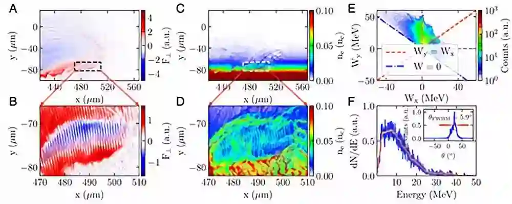 Fig. 4 数值模拟结果。(A,B)激光强度分布,(C,D)等离子体密度分布。E,电子束能量增益相空间分布。F,电子束能谱和角分布。