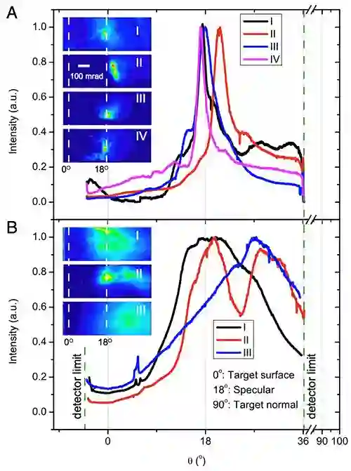 团队利用美国劳伦斯利弗莫尔国家实验室的Titan激光器(功率:200TW,脉宽:1ps)与固体铜靶相互作用(图1),产生了电荷量~100纳库,发散角小于3度(图2,3),具有准单能能谱结构的相对论电子束。电子束的品质可以通过调节激光脉冲的对比度和能量来很好的控制。通过理论分析和数值模拟还揭示了一种新型加速机制:通过激光预脉冲在固体表面提前离化产生近临界密度的预等离子体;主脉冲大角度入射预等离子体,在其中经历自成丝效应,部分细丝会被临界密度面反射,从而在低密度等离子体中形成通道;激光电场会在每一个光学周期内加速一群电子,这些电子群在等离子体通道内被加速成极高电荷量的电子束并被通道中极高的电磁场横向箍缩,从而具有高度的准直性(图4)。通过分析电子能量增益来源,发现不同于典型的尾波场电子加速,通道内的电子能量主要来源于比等离子体波电场强度还要高的激光电场的直接加速(图4E),而等离子体通道的作用则是持续提供电子源、导引激光脉冲并对电子束进行箍缩,这样就形成了完整的加速结构。