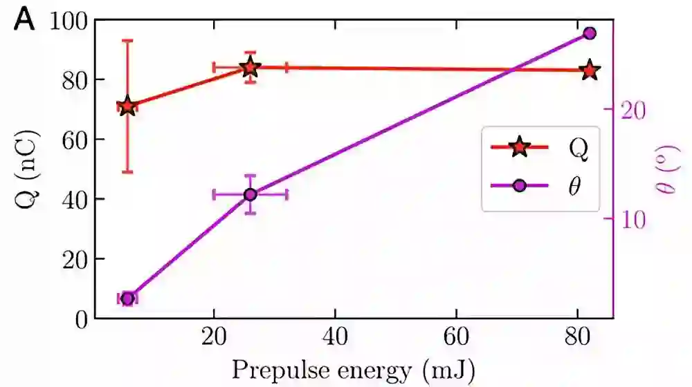 Fig. 3 电子束电荷量和发散角随激光预脉冲能量大小的变化。