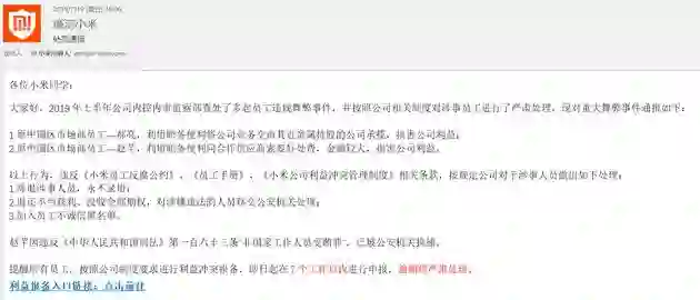 昨日晚间,小米内部通报称,两位中国区市场部员工违规舞弊,已被辞退并移送公安机关。通报邮件称,小米2019年上半年查处了多起员工违规舞弊案件。其中,原中国区市场部员工郝亮,利用职务便利将公司业务交由其近亲属持股的公司承揽;原中国区市场部员工赵芊,利用职务便利向合作供应商索要好处费,金额较大。