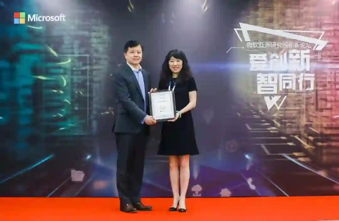 微软亚洲研究院院长洪小文为华夏基金总经理李一梅颁发创新汇会员证书
