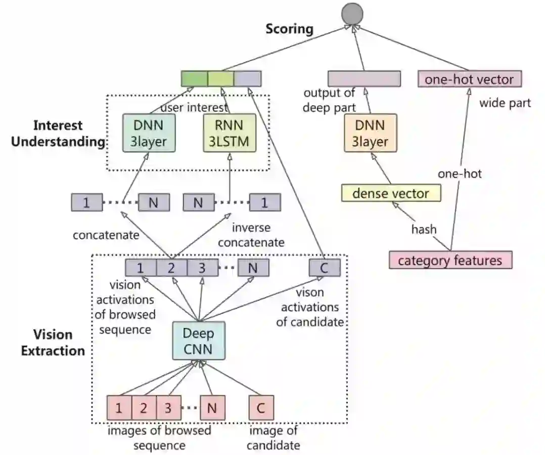 这些研究给我们带来了灵感来设计这样一个排序引擎,它能像人一样提取视觉信号,并从视觉角度来理解用户。参考大脑结构,我们把这个排序引擎分为三个组件:一个是视觉感知模块(Vision Extraction),它模拟人脑的视神经系统,提取商品的关键视觉信号并产生激活;另一个是兴趣理解模块(Interest Understanding),它模拟大脑皮层,根据视觉感知模块的激活神经元来理解用户的潜意识(决定用户的潜在兴趣)和表意识(决定用户的当前兴趣);此外,排序引擎还需要一个打分模块(Scoring),它模拟决策系统,计算商品和用户兴趣(包括潜在兴趣和当前兴趣)的匹配程度。