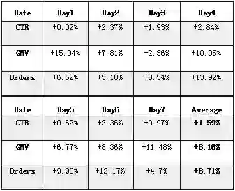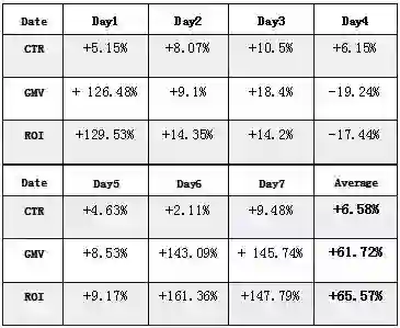 作为一项以应用为目标的基础研究成果,Telepath在京东的诸多场景都有落地,在推荐、广告等实际业务中都发挥了作用。表1和表2分别展示了Telepath在一个京东App推荐位和一个京东广告合作媒体上线的效果,可以看出,在这两种场景下,点击率(CTR)和GMV都有显著的效果提升。