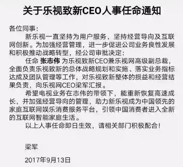 昨日,乐视网CEO梁军发布内部信,宣布任命张志伟为乐视致新CEO兼乐视网高级副总裁,全面负责乐视致新的总体战略规划和实施、落实业务指标达成及团队管理等工作,对乐视致新整体的损益和经营结果负责,向乐视网CEO梁军汇报。