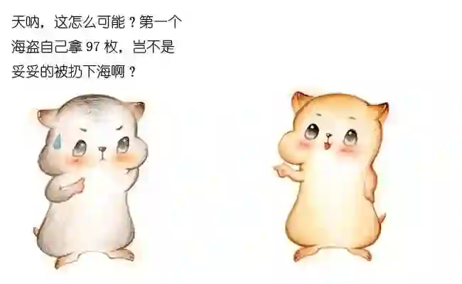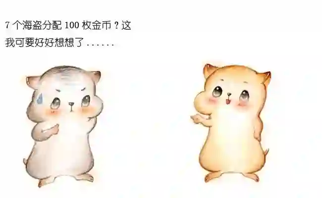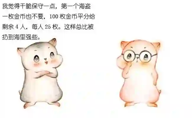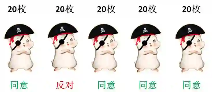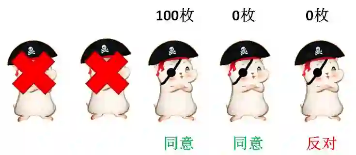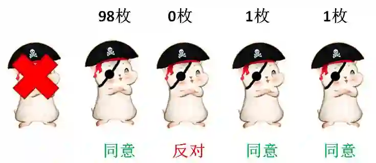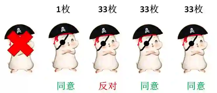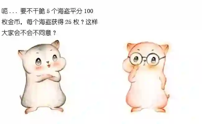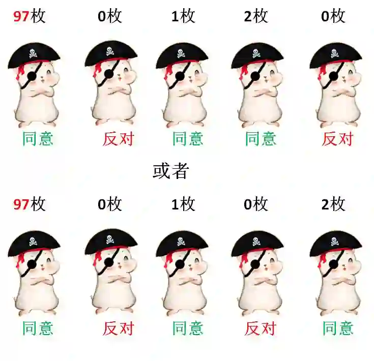 第三个海盗反对,剩下两个小伙伴同意,同意者超过了半数(4 : 1),于是按照这个方法执行了分配。
