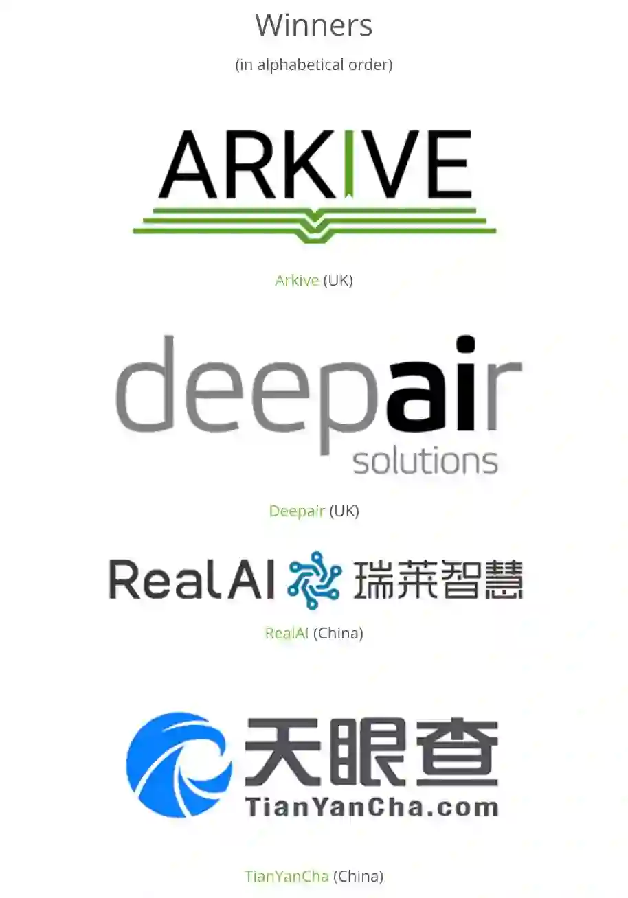 四家获奖公司中,两家来自英国,另两家则是国内创业公司,其中包括清华大学 AI 研究院的创业公司 RealAI(瑞莱智慧)以及企业征信机构天眼查。