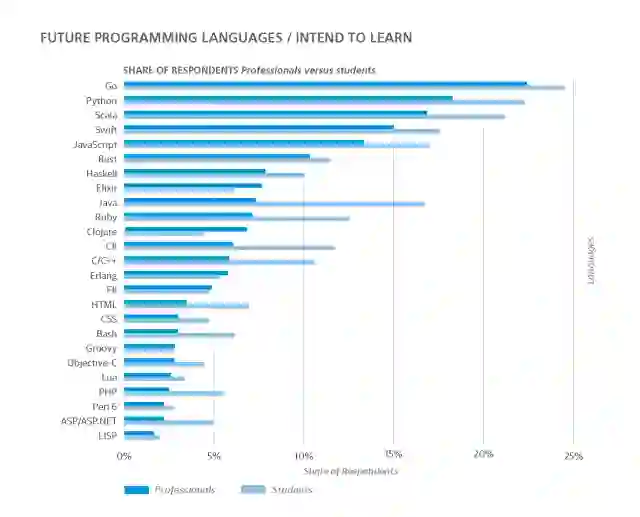 虽然 Android 主要以 Java 编写,但 Google 的另一个编程语言 Go 也是一个热门话题。在未来最想学习的编程语言中排名第一,有 23% 的受访者想要学习它。未来最想学的语言排行中,前五名分别是:Go、Python、Scala、Swift 以及 JavaScript。