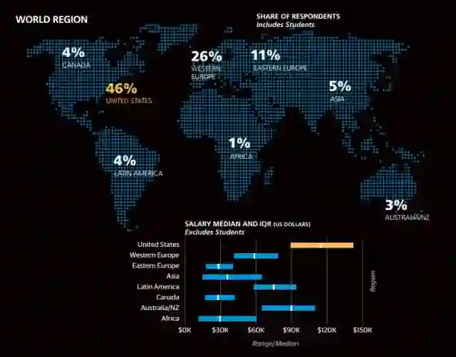 加利福尼亚州的薪金比美国的任何其他地区高出 15 至 20K 美元,中位数为 13.9K 美元。东欧、非洲和加拿大赚得最少。不过这项没有把不同地区的生活成本差异以及各个地区的人才需求考虑进去。