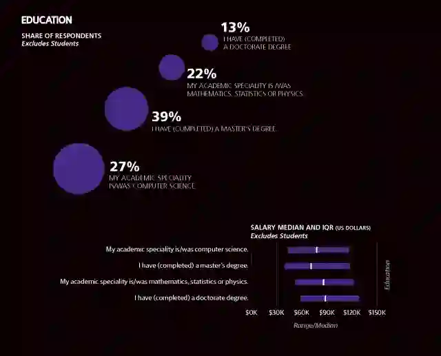有一半以上的受访者为计算机专业出身,与去年相同。40% 的开发者拥有硕士学位,约 6% 具有博士学位。这种额外的教育似乎得到回报:硕士研究生的薪酬比例高出约 18%,而博士的薪资则要高出高出 45%。
