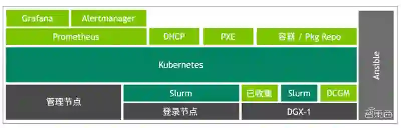 DGX POD 管理软件层由 Kubernete 容器协调框架上运行的各项服务组成,可通过网络(PXE)为动态主机配置协议(DHCP)和全自动 DGX OS 软件配置提供服务。