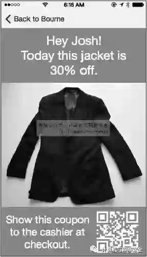 先考虑一种情况,Bourne最近已经采购一种新的男装运动外套系列。以前的产品系列在商店卖得很好,但需要清理库存以便让出空间给新的系列。这时如果一个用户的iOS设备运行的移动应用程序检测到自己在Bourne老产品系列的“附近”,那么它可以在设定了该客户的性别以后,查询该客户的偏好、过去的购买记录(该用户是否已经购买过这个系列款式),以及支出分析(是否该用户购买过这个物品,在历史购买记录上是否打折或折扣的级别),动态地生成一个优惠券,或向其iOS设备提供其他通知,优惠券如图5所示。随后,移动应用程序可以确定,如果用户决定使用优惠券,那么Bourne决定给这个顾客这件运动夹克较大的折扣价;如果用户不使用优惠券,那么会给这个顾客在下次进入本店消费时,提供一个更优惠的价格。