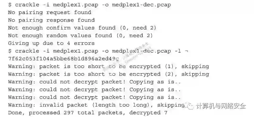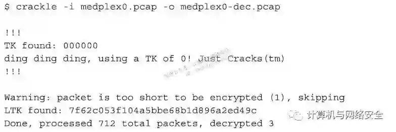 在上面这个例子中,第一次尝试使用Crackle软件还原“临时密钥”是失败的,失败的原因是在“配对交换”过程中缺少必要的数据包。然而因为我们在前面的步骤中,已经捕获到“长期密钥”,所以我们可以在命令行程序中通过“-l”(小写字母L)参数指定这个“长期密钥”,然后再破解这些数据。