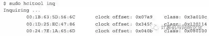 通过蓝牙侦听类的扫描器,对每一个扫描到的设备,都可以获得设备的“服务类型”和“设备类型”信息。在Linux操作系统的命令行下,我们可以扫描“可发现的”模式下的“基本速率蓝牙”和“增强数据速率蓝牙”蓝牙设备,并且读取它们的“服务类型”和“设备类型”信息。完成读取命令,是通过hcitool命令完成的,命令格式如下: