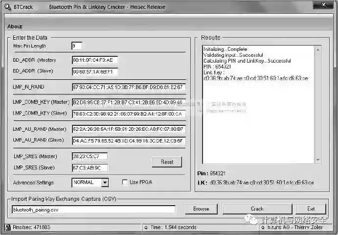 要使用BTCrack软件,首先要进行“配对交换”数据包的捕获。在这一点上,可选的工具非常多,超牙系统、Wireshark软件、“前线蓝牙协议分析器600通信探测”设备、Ellisys公司的“蓝牙资源管理器400”,都可以在两个通信的蓝牙设备之间捕获“配对交换”数据包,并从中识别出“发起随机数”、两个“COMB_KEY值”、“认证随机数”、“签署响应”等值,一旦这些字段的值被捕获到或计算出,随后就可以确定“个人身份码”的最大长度,通过这个值,BTCrack软件就可以发起一起还原“个人身份码”的攻击了。对于BTCrack程序来说,上面的操作只需要单击“破解”(Crack)按钮即可,随后Crack程序就会通过暴力破解的方式对“个人身份码”进行破解,直到最终破解成功,拿到“个人身份码”的值;或者将字典中,所有可能的“个人身份码”全部用完,仍然没有正确的“个人身份码”,这时就意味着破解失败。