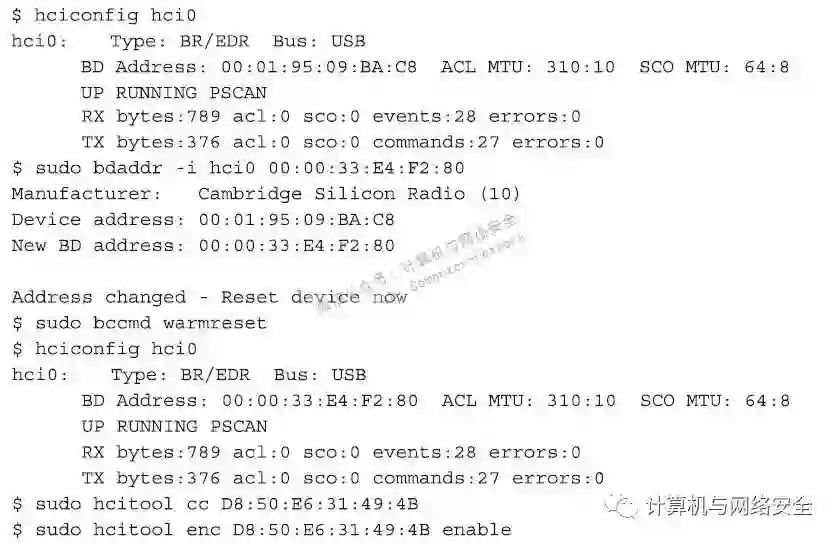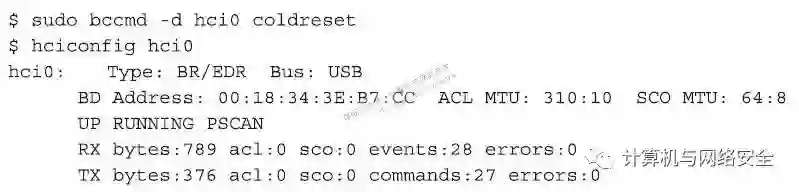 要将攻击者的蓝牙加密狗返回到原始的“蓝牙设备地址”BD_ADDR配置,我们可以使用Linux下bccmd工具中的coldreset命令实现,其操作步骤如下。