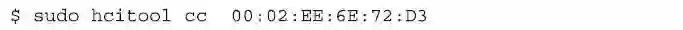 再打开一个窗口,并在新的这个窗口中运行hcitool命令,并附带一个“cc”参数。该参数的作用是指定的是远端设备的“蓝牙设备地址”。这是创建一个与所指定这个目标蓝牙设备之间的连接。