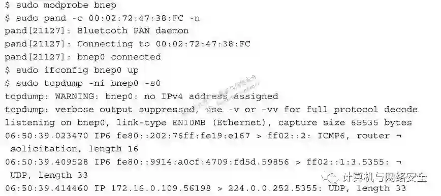 一旦我们创建好bnep0接口,下面就可以通过Belkin F8T030拥有一个以太网网桥,通过这个网桥可以连接到位于Belkin F8T030后面的有线网络。在本例中,我们可以运行tcpdump工具,跟踪IPv6和IPv4在网络中的广播通信数据包在网络上的传送。或者,我们也可以在局域网上,为bnep0接口手工配置一个IP地址,或者使用“动态主机配置协议”客户端自动请求一个动态的IP地址,其步骤如下所示: